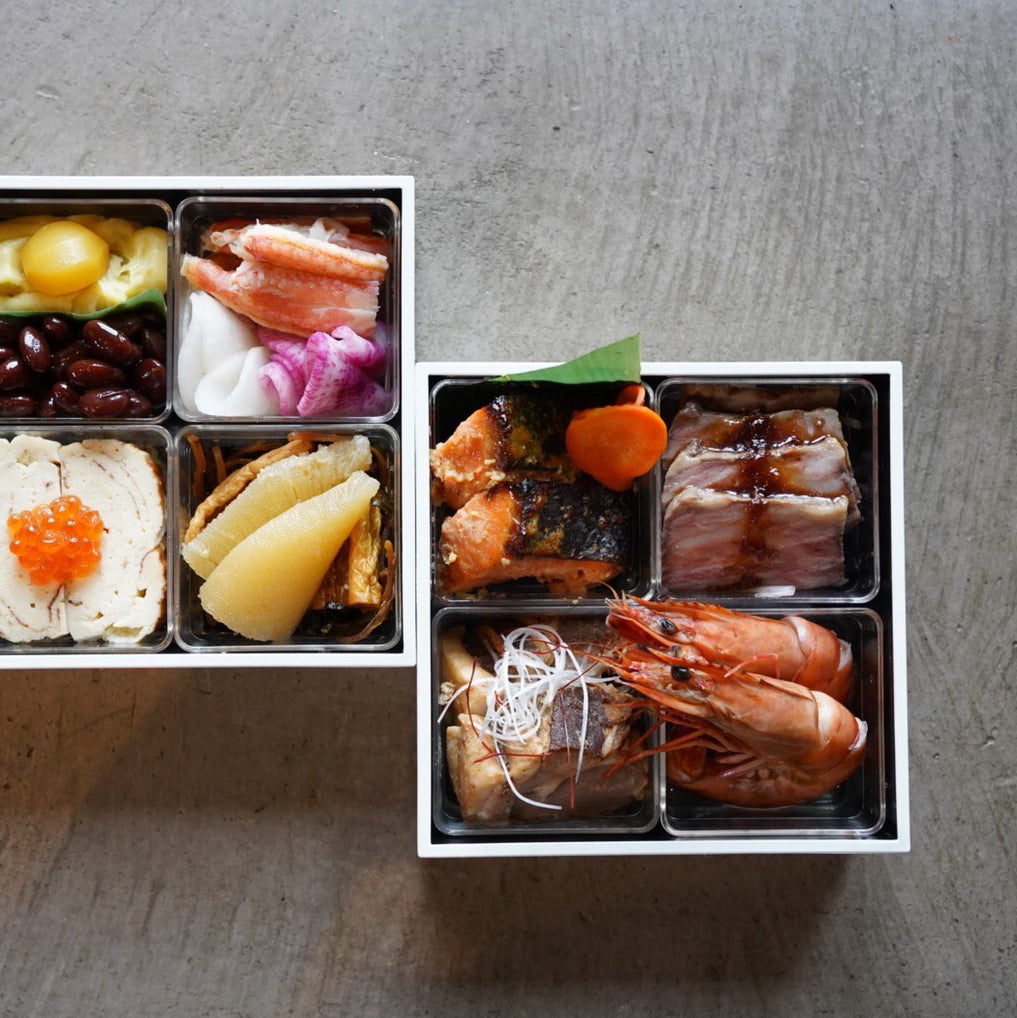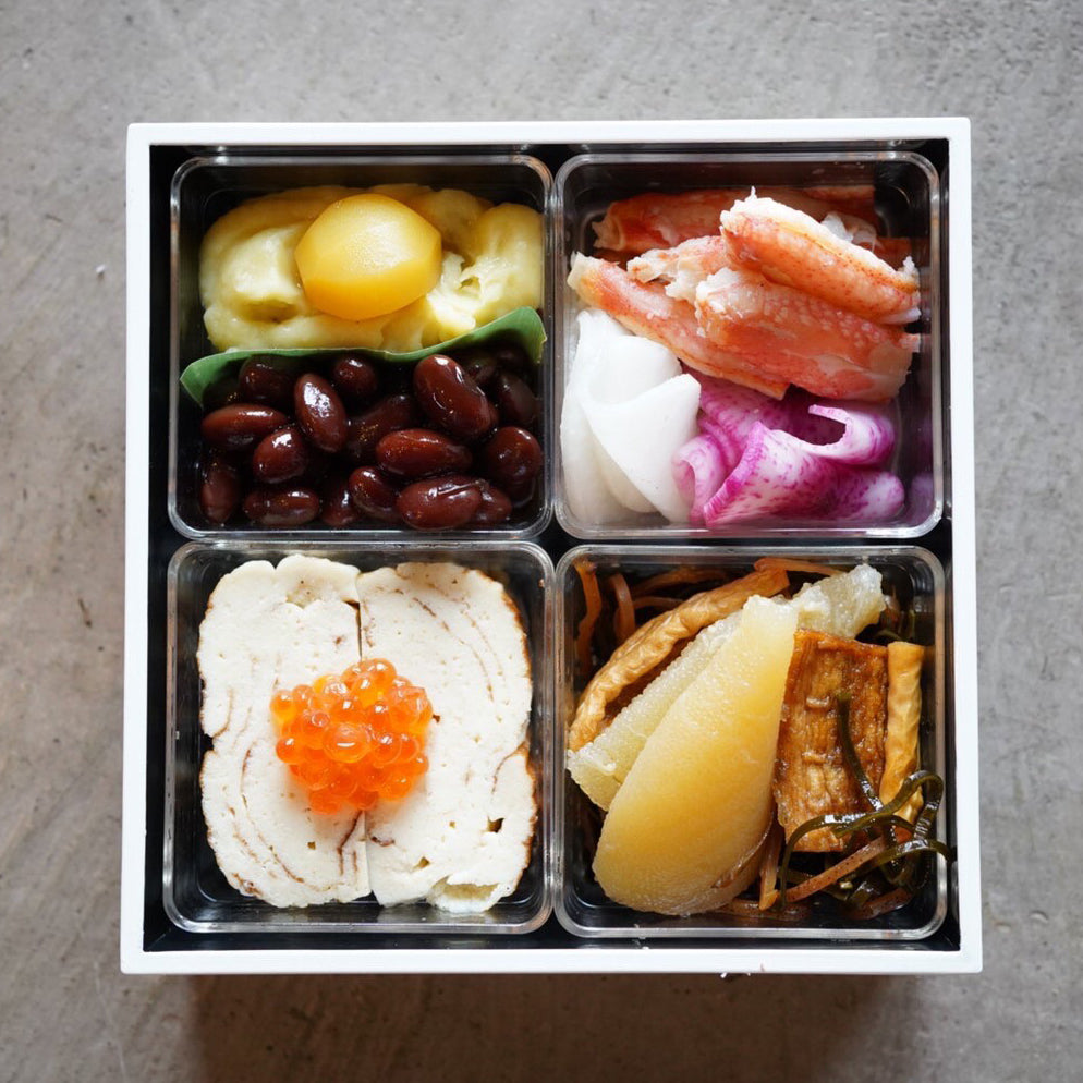 3日間煮込んだ黒豆煮/越のむらさきの丸大豆醤油仕立て/数の子の新潟あご出汁漬け/巻の割干し大根のはりはり漬け/ズワイカニの八珍柿酢マリネ/雪大根紅白なます/自家製いくらの新潟醤油漬け/地卵と自然栽培米の甘酒、豆富の伊達巻/丸山さんの安納芋と自家製干し柿の芋栗きんとん