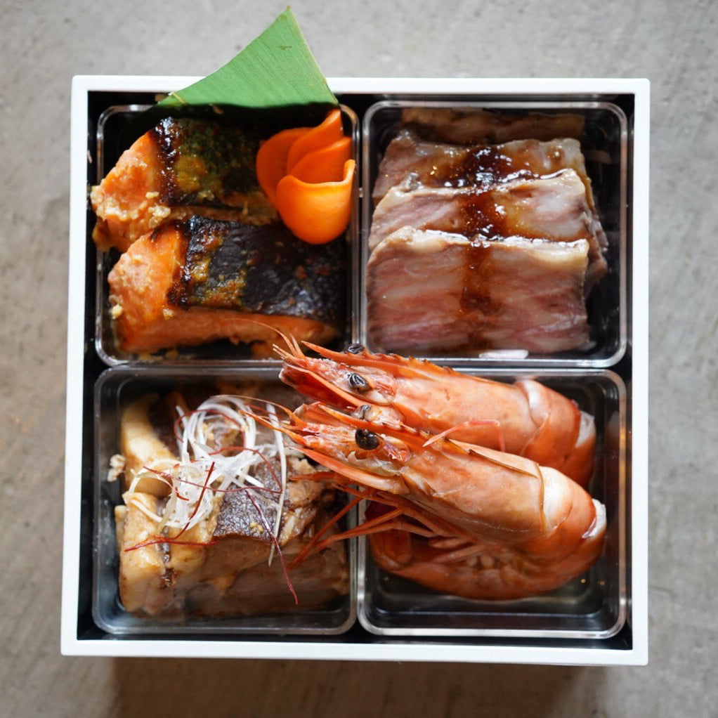 コシヒカリで育った越路ポークの豚角煮-サフラン酒仕立て-/地酒で仕立てた大海老の旨煮/72時間仕込み 松井さんの山古志にいがた和牛のローストビーフ/雪室にんじんの甘酢漬け/佐渡銀鮭の玄米甘麹味噌の漬け焼き